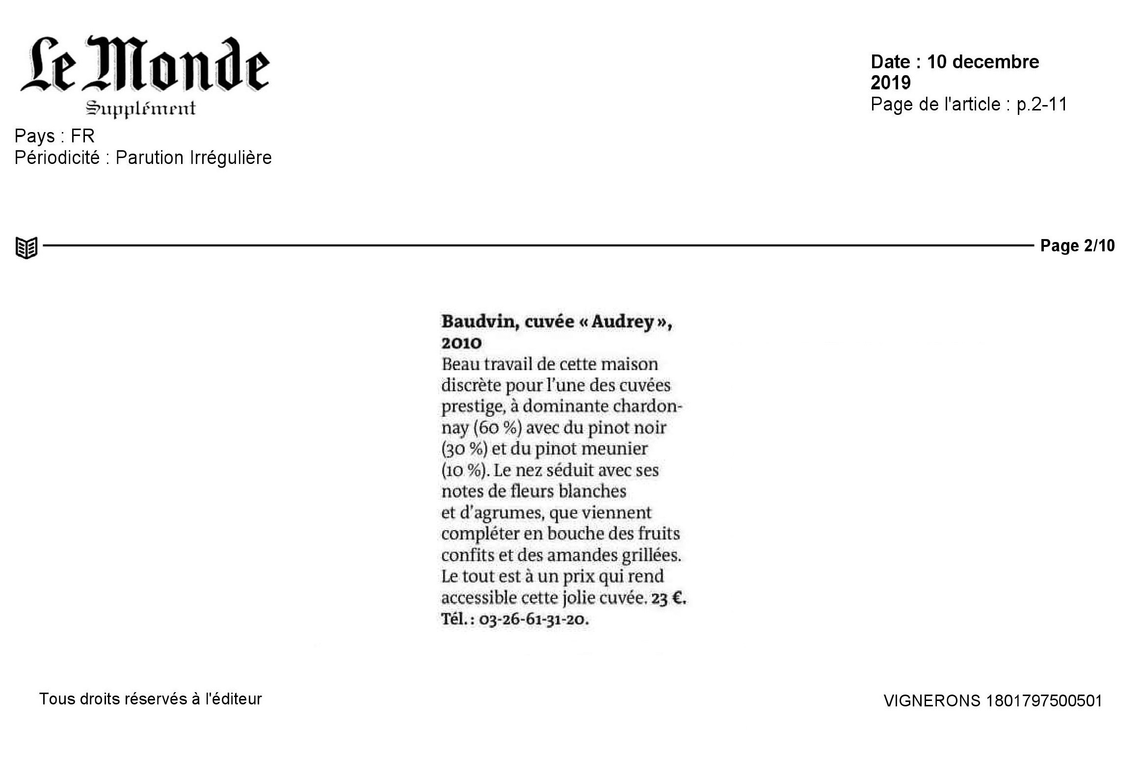 Parution dans le journal le monde pour Notre Cuvée Audrey "Millésime 2010".